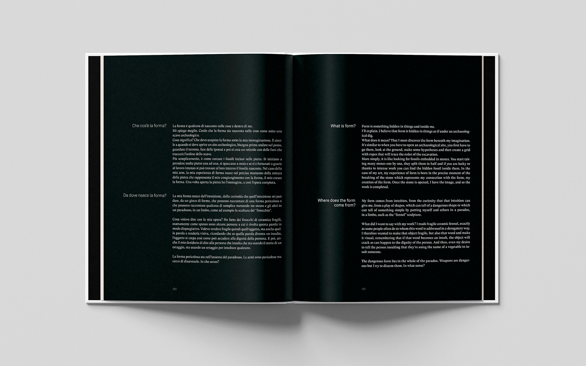 L’impianto editoriale riflette questa impostazione: il progetto grafico lavora per sottrazione, ritmo e silenzio, lasciando che testo e immagini si dispongano come elementi autonomi ma interdipendenti. La struttura visiva accompagna il lettore in un attraversamento lento, quasi meditativo, in cui il libro diventa spazio di esperienza e non semplice contenitore di contenuti.