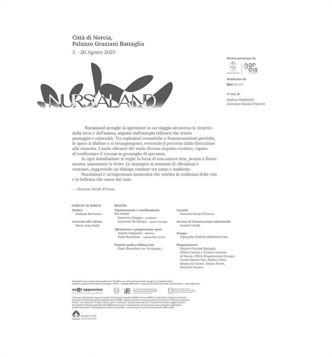 All’interno di Castellina art and sound, un ruolo di rilievo spetta a Nursialand, mostra di arte contemporanea ospitata per la prima volta a Palazzo Graziani Battaglia, simbolo ritrovato della città grazie alla ricostruzione post-sisma. Per Nursialand, art-bit design&c. non solo ha curato l’identità visiva completa, ma ha assunto anche la responsabilità dell’allestimento: dalla progettazione degli spazi espositivi alla valorizzazione delle opere, in un percorso immersivo che accompagna il visitatore in un viaggio dalla distruzione alla rinascita.