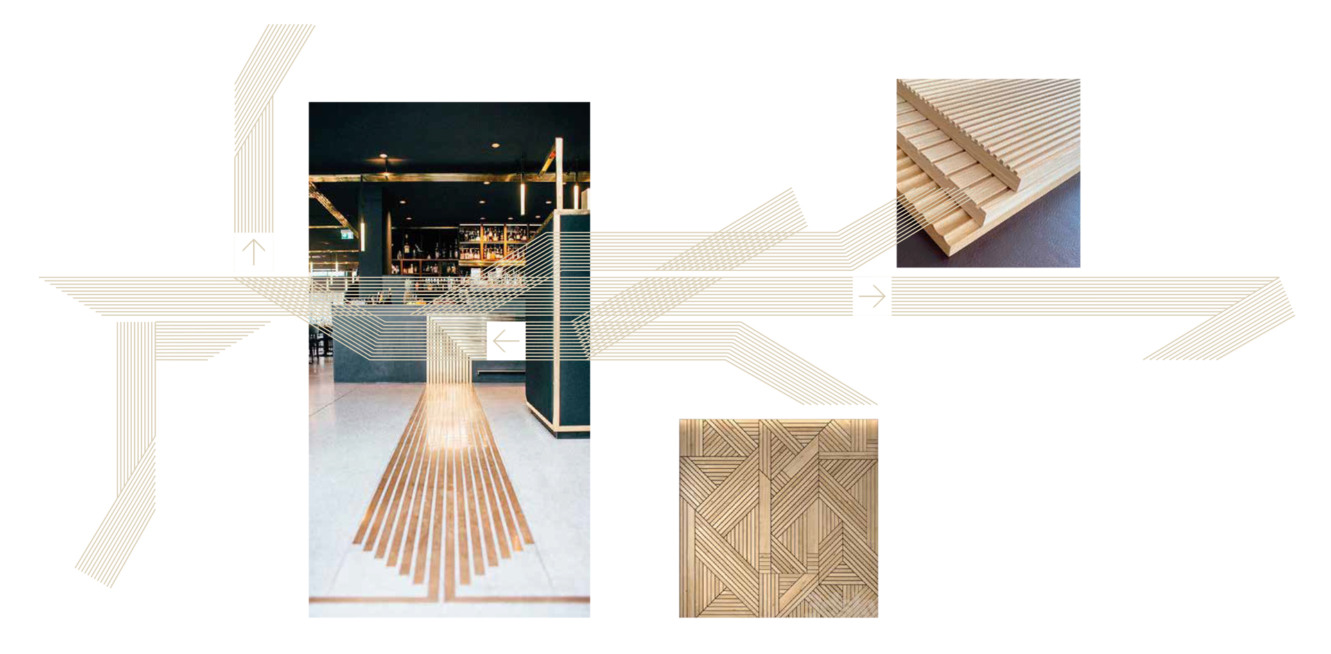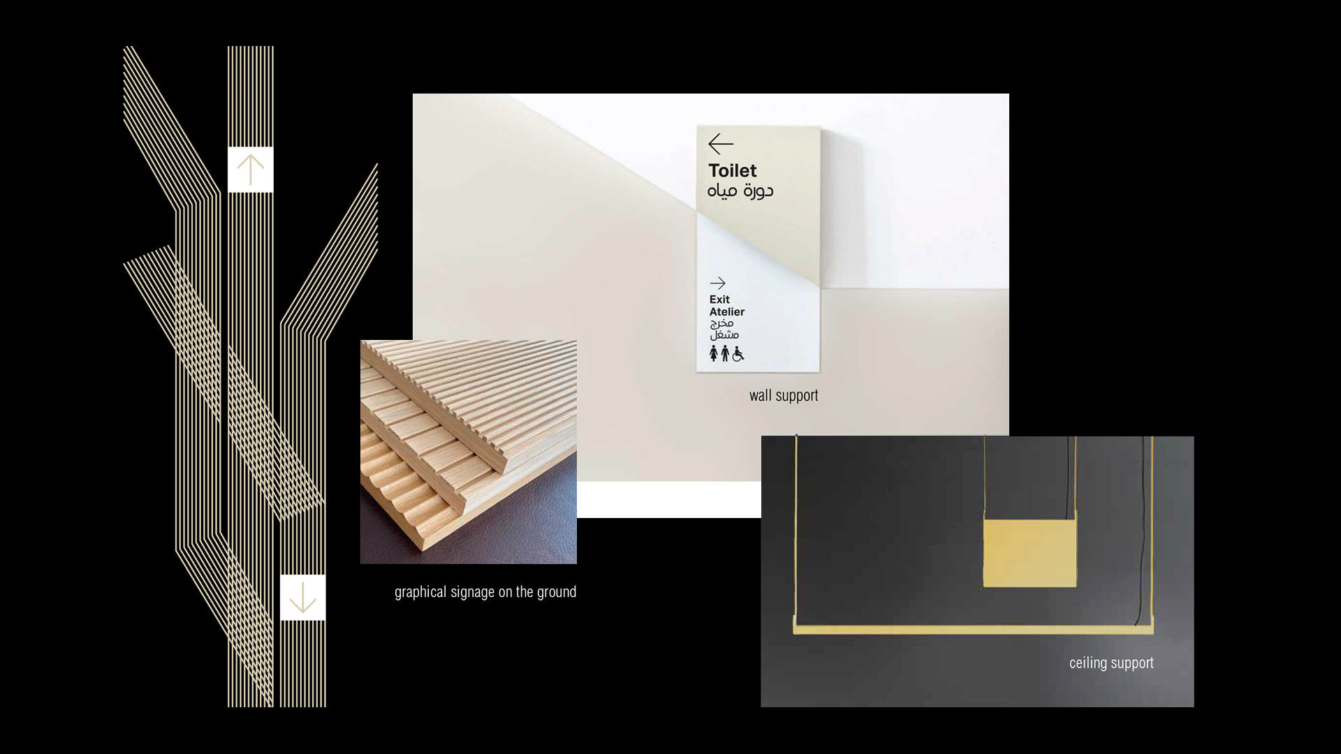 L’elemento più distintivo del progetto è l’uso di pattern e trame lineari, ricavate da studi materici su moduli lignei e superfici geometriche: una grammatica visiva che ritorna nelle pannellature, nei percorsi e nei pittogrammi, costruendo un linguaggio riconoscibile e adatto a un’esperienza museale immersiva. Le trame, basate su ripetizioni ritmiche e variazioni direzionali, diventano strumenti narrativi che guidano lo sguardo e definiscono continuità tra pareti, pavimenti e sistemi informativi.