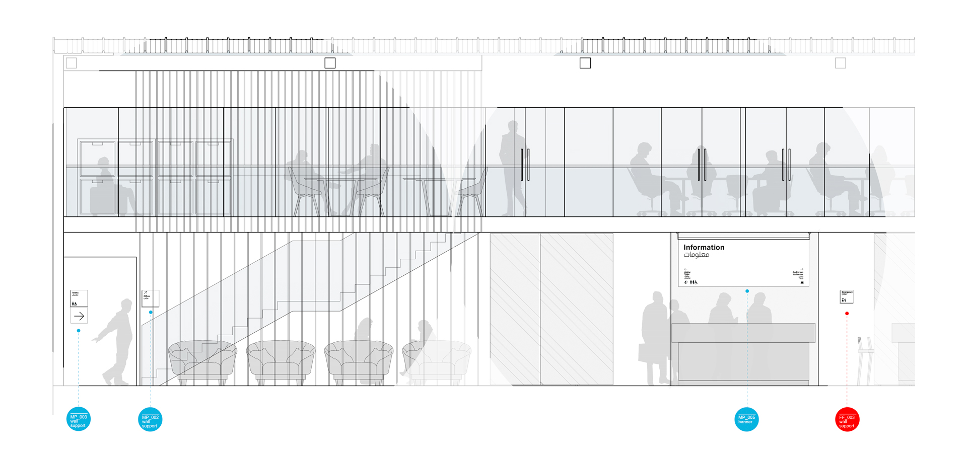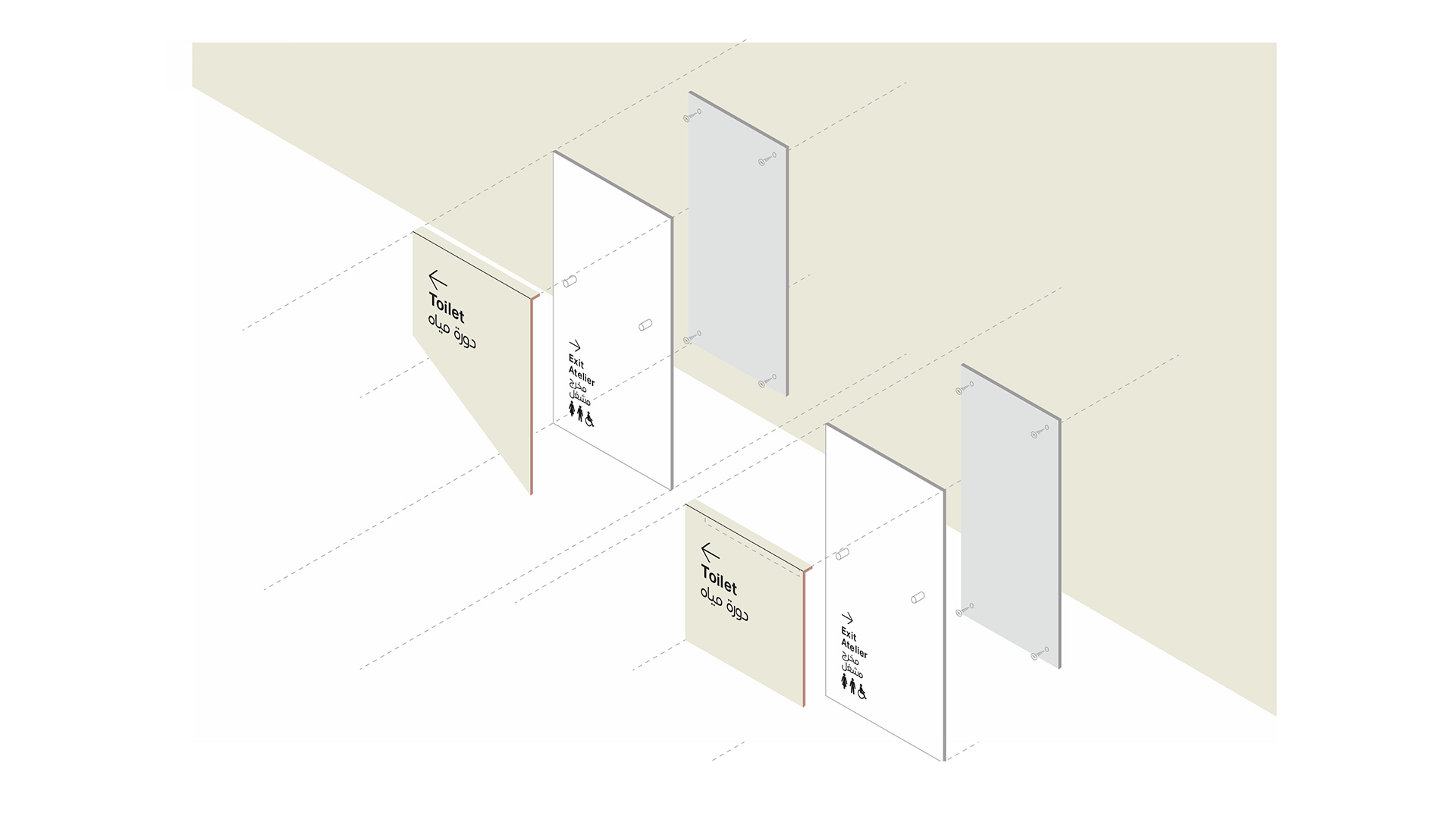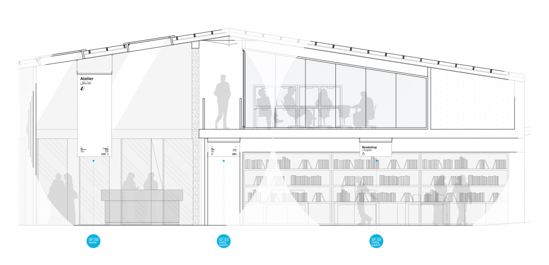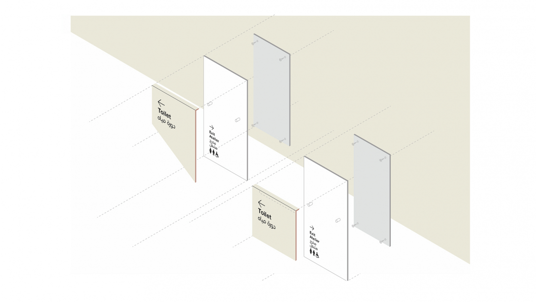 Il wayfinding è progettato come un’estensione naturale dell’architettura: flussi, direzioni e nodi di movimento vengono interpretati attraverso vettori lineari che amplificano la percezione dello spazio e chiariscono la gerarchia dei percorsi. I pittogrammi, sviluppati per derivazione modulare, uniscono rigore tipografico e trattamento materico, riflettendo la stessa trama dei pannelli e garantendo coerenza tra micro e macro-segno.