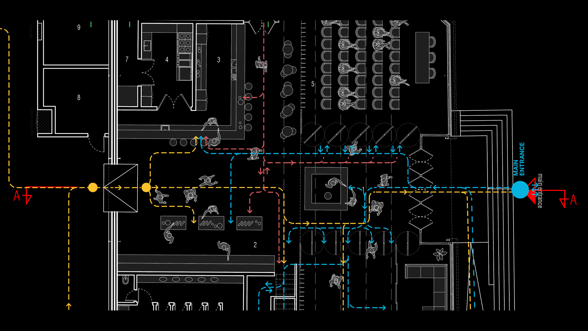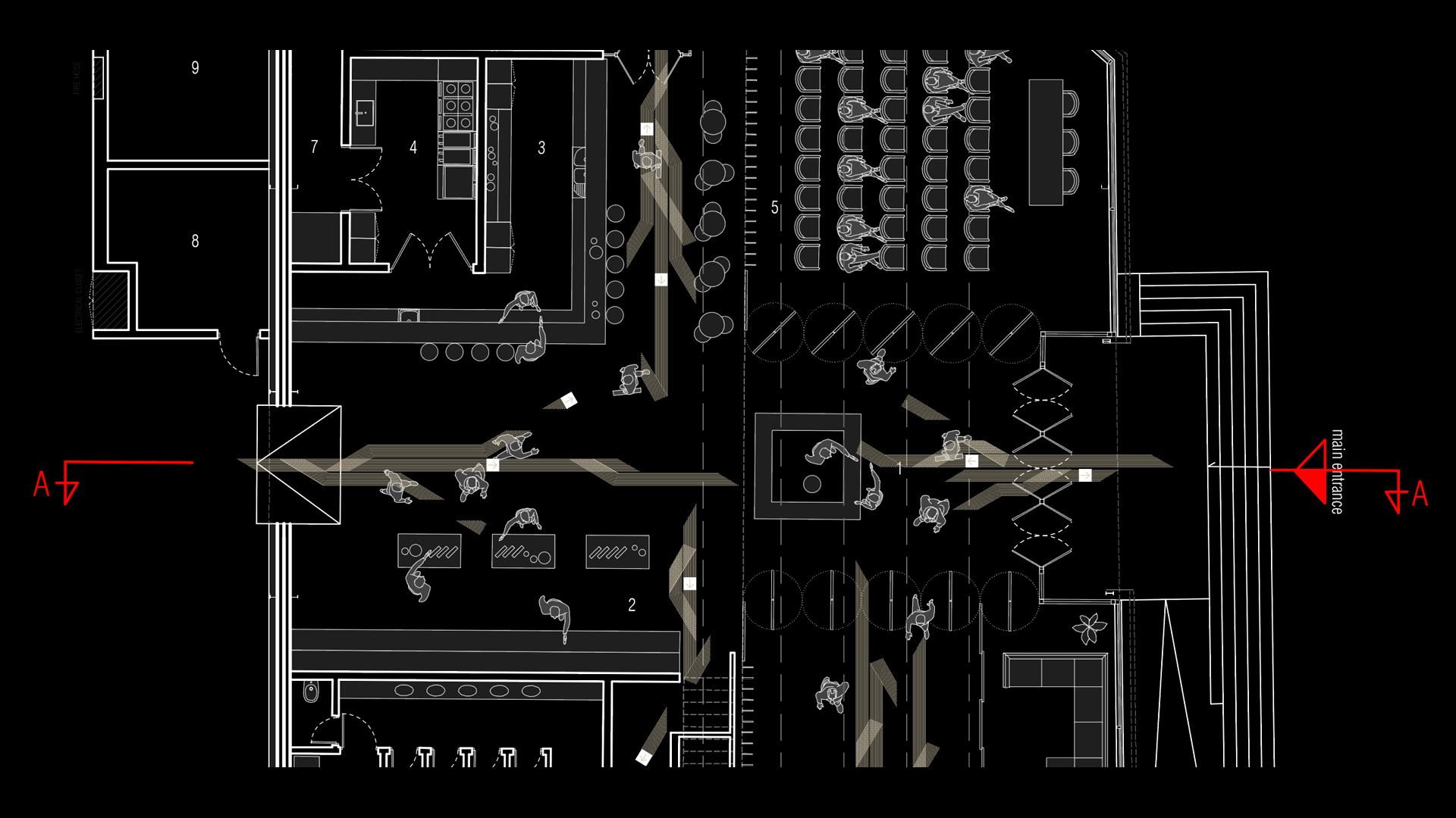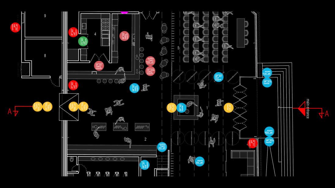 Il wayfinding è progettato come un’estensione naturale dell’architettura: flussi, direzioni e nodi di movimento vengono interpretati attraverso vettori lineari che amplificano la percezione dello spazio e chiariscono la gerarchia dei percorsi. I pittogrammi, sviluppati per derivazione modulare, uniscono rigore tipografico e trattamento materico, riflettendo la stessa trama dei pannelli e garantendo coerenza tra micro e macro-segno.